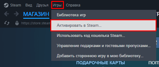 Для активации ключа откройте Steam и в левом верхнем углу выберите пункт Игры